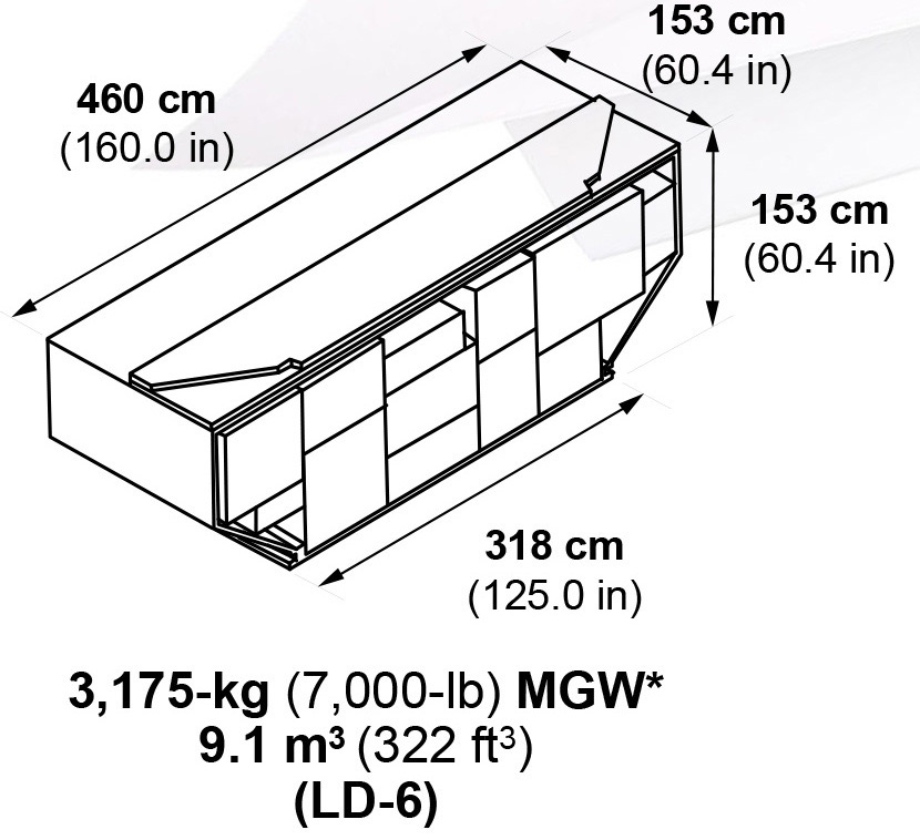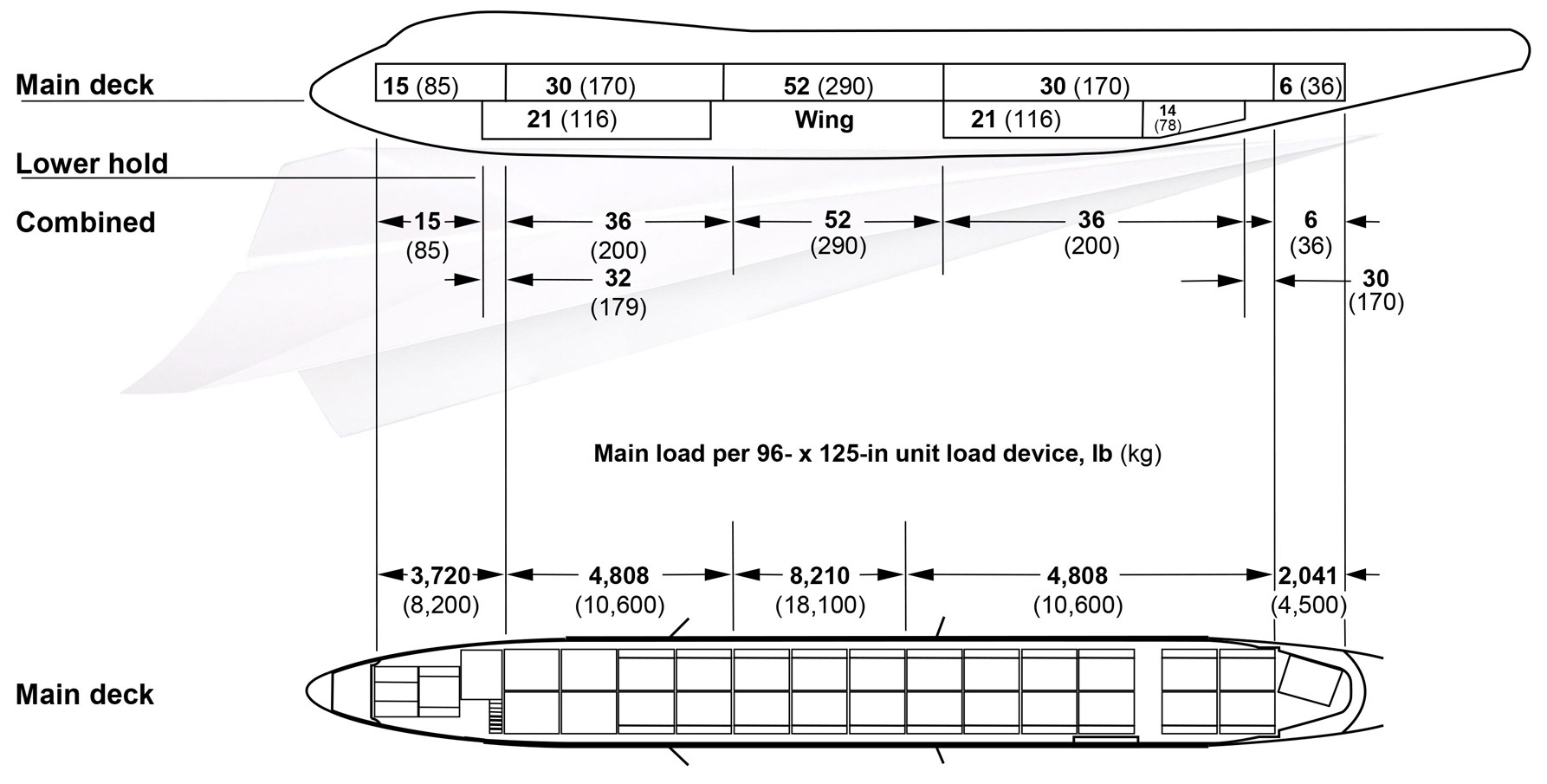 3Highest available MZFW, only available with 367,860-kg (811,000-lb) MTOW. Operating restrictions require linear reduction in MTOW with MZFW increase from 276,690 to 288,030-kg (610,000 to 635,000 lb).