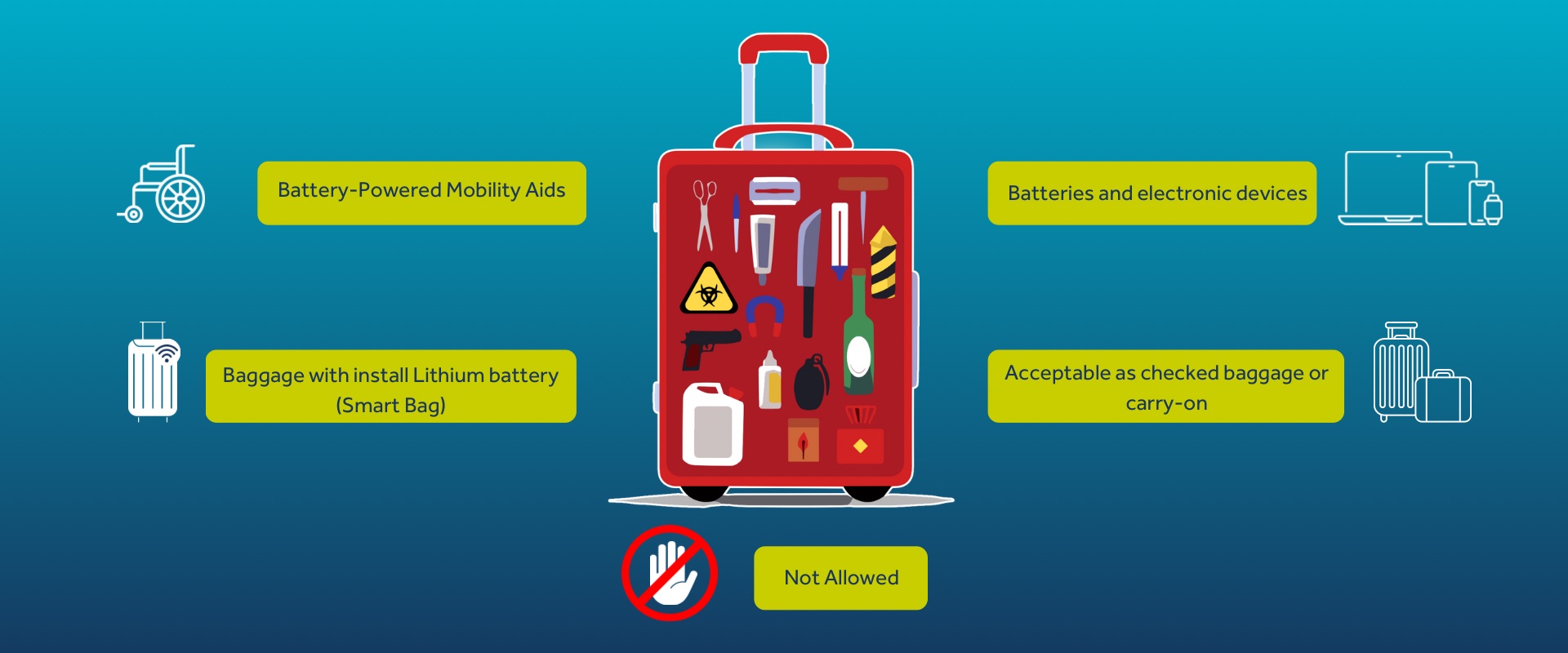 For your safety and to comply with international regulations, there are restrictions on the items you can bring in your baggage. Dangerous goods are items that could be harmful to health, safety, property, or the environment. Please check the information below to see what dangerous goods are allowed, what’s prohibited, and where they can be carried—on your person, in your hand baggage, or in your checked baggage. If you need approval to carry certain dangerous goods, please contact us at least three working days before your flight date.